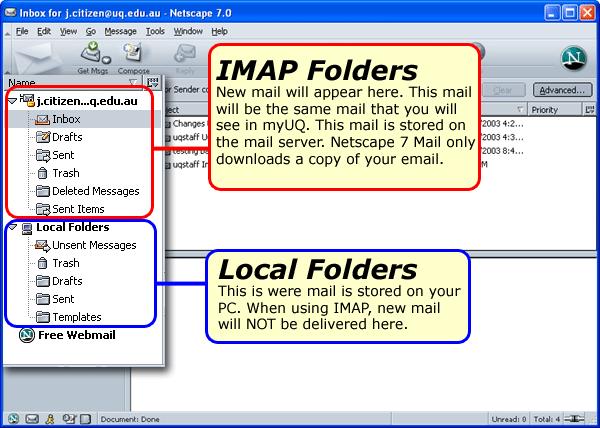 | 3)The left pane displays the accounts and folders you have previously setup. If you're running Netscape or Mozilla for the first time this area will not display any account details (as above). |
